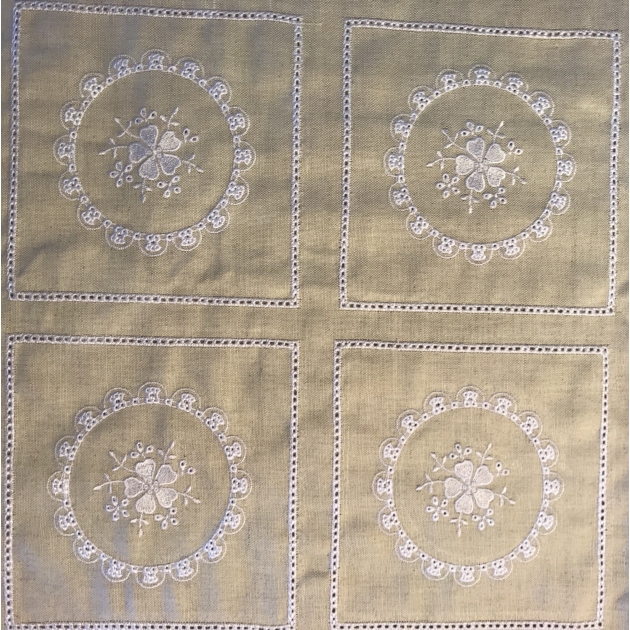 Conheça a nossa coleção de bordados e ajurados da roda. Ajurado em linha branca bordado em linha branca . Bordado em linho rustico de cor bege escuro :50%LINHO 50%ALGODÃO Tamanho de cada aplicação : 0,15CM X 0,15CM.
