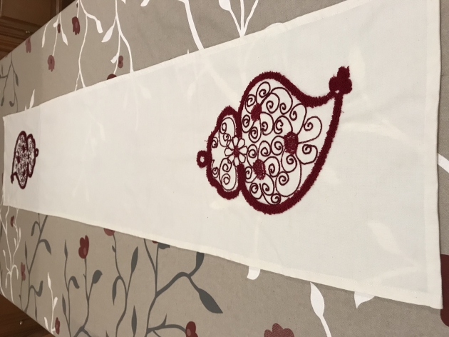 nosso fabrico caminho de mesa bordado com lá . 55%linho 45%algodão tam. aproximado 50x150cm